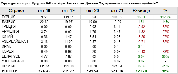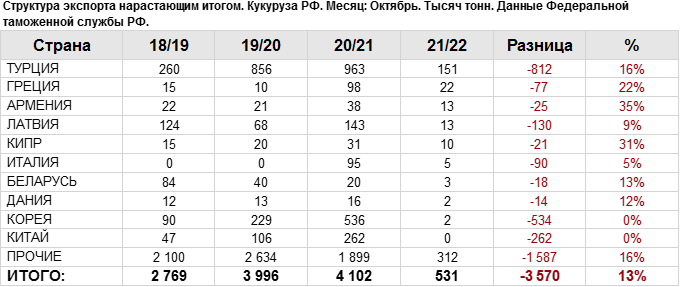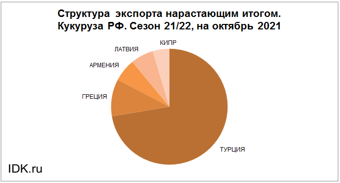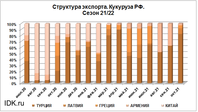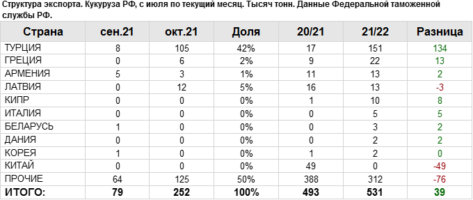Объем поставок кукурузы на экспорт за период с июля 2021 года по октябрь 2021 года в Турцию составил 150.61 тыс. тонн, что на 133.76 тыс. тонн больше объема поставок в данную страну в прошлом сезоне на тот же отчетный месяц.