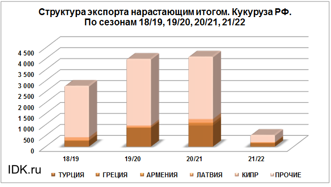 Структура экспорта кукурузы из России нарастающим итогом по сезонам