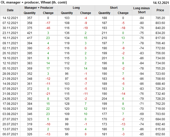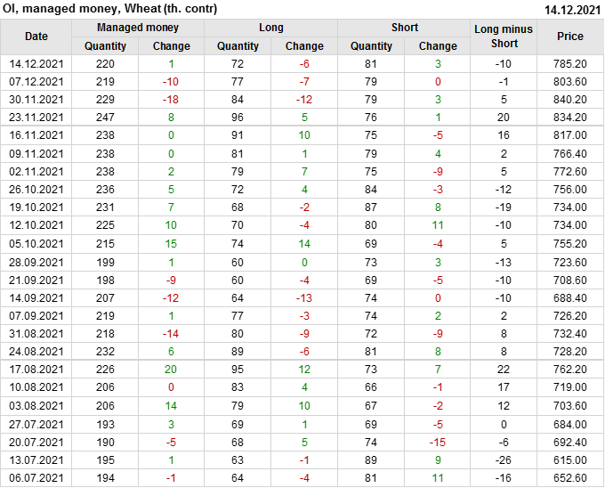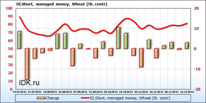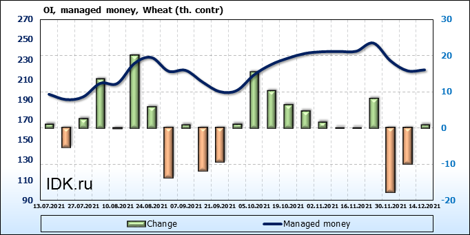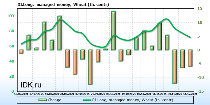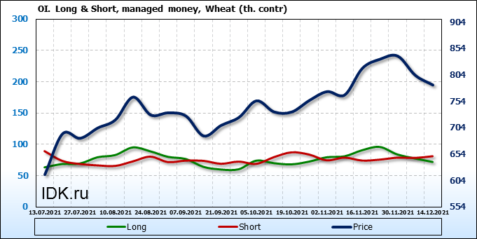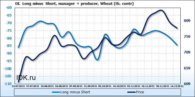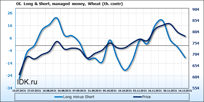 За прошедшую неделю, 08.12.21 — 14.12.21, разница между длинными и короткими позициями управляющих увеличилась на 8.4 тыс. контрактов. В тоже время, цена упала на 18.4 цента.