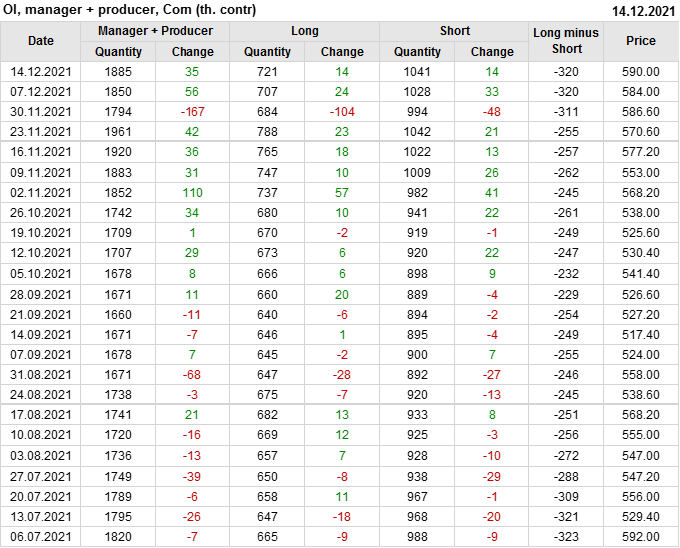 За прошлую неделю, 08.12.21 — 14.12.21, разница между длинными и короткими позициями управляющих увеличилась на 14.6 тыс. контрактов. В тоже время, цена выросла на 6 центов.