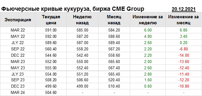На 20.12.2021 стоимость кукурузы на бирже CME Group по контракту MAR 22 составила 591 цент за бушель. За прошедшую неделю стоимость кукурузы на площадке CME Group выросла на 6 центов/бушель. Как мы видим на графике, фьючерсная кривая имеет периоды, когда более дальний фьючерс дешевле ближнего. Состояние бэквардации наблюдаем на следующих контрактах: JLY 22; SEP 22; DEC 22; JLY 23; SEP 23; DEC 23. Таким образом, трейдеры предполагают, что возможно превалирование предложения над спросом в указанные периоды.