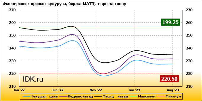 На 20.12.2021 стоимость кукурузы на бирже MATIF по контракту Jan ’22 составила 241.75 евро за тонну. За прошедшую неделю стоимость кукурузы на европейской площадке упала на 3.75 евро/тонна. Как мы видим на графике, фьючерсная кривая имеет периоды, когда более дальний фьючерс дешевле ближнего. Состояние бэквардации наблюдаем на следующих контрактах: Mar ’22; Nov ’22; Aug ’23. Таким образом, трейдеры предполагают, что возможно превалирование предложения над спросом в указанные периоды.