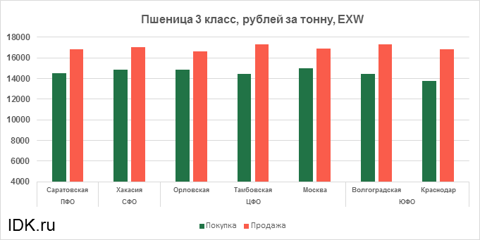 За прошедшую неделю с 20.12.2021 по 24.12.2021 средняя цена на пшеницу 3-го класса, согласно выставленным заявкам трейдеров, упала по всем округам на 355 рублей. Средняя цена составляет 15757 рублей за тонну.