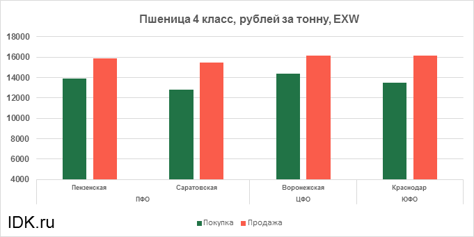 За прошедшую неделю с 20.12.2021 по 24.12.2021 средняя цена на пшеницу 4-го класса, согласно выставленным заявкам трейдеров, выросла по всем округам на 58 рублей. Средняя цена составляет 14863 рубля за тонну.