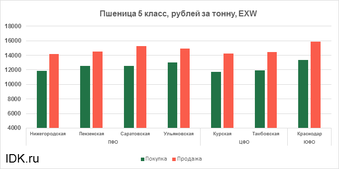 За прошедшую неделю с 20.12.2021 по 24.12.2021 средняя цена на пшеницу 5-го класса, согласно выставленным заявкам трейдеров, выросла по всем округам на 117 рублей. Средняя цена составляет 13767 рублей за тонну.