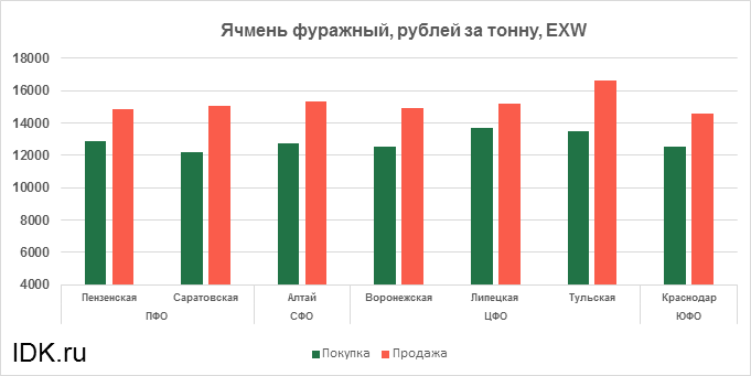За прошедшую неделю с 20.12.2021 по 24.12.2021 средняя цена на фуражный ячмень, согласно выставленным заявкам трейдеров, выросла по всем округам на 667 рублей. Средняя цена составляет 13908 рублей за тонну.