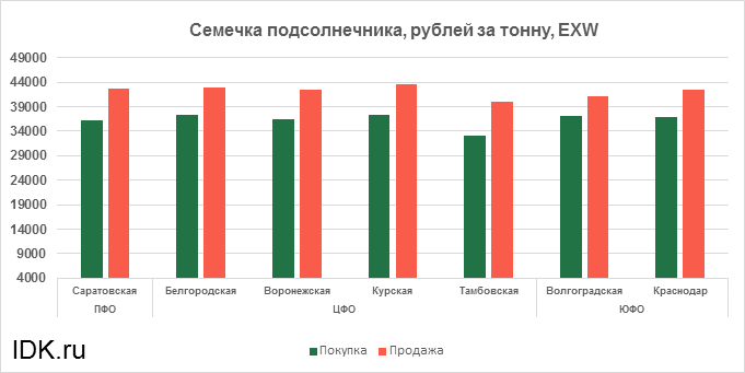 За прошедшую неделю с 20.12.2021 по 24.12.2021 средняя цена семечки подсолнечника, согласно выставленным заявкам трейдеров, упала по всем округам на 1296 рублей. Средняя цена составляет 39449 рублей за тонну.