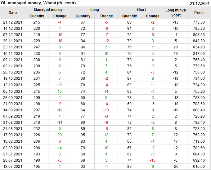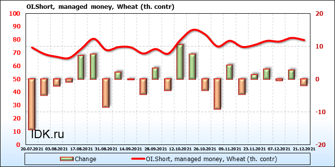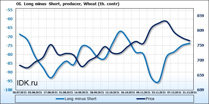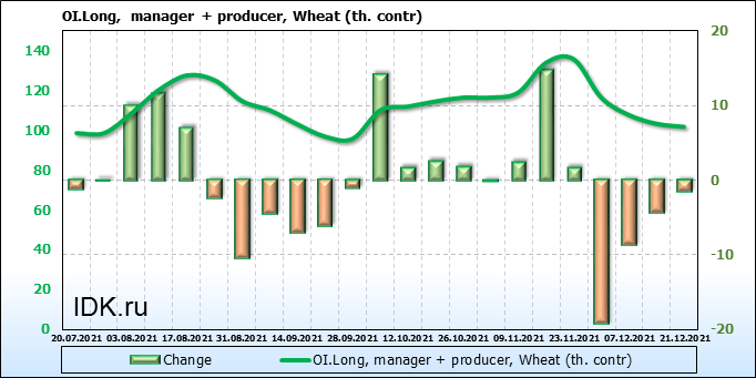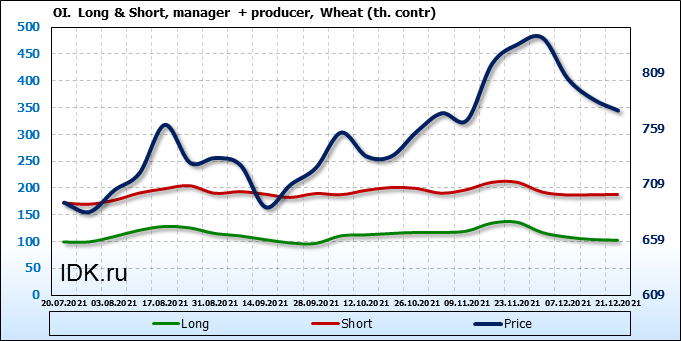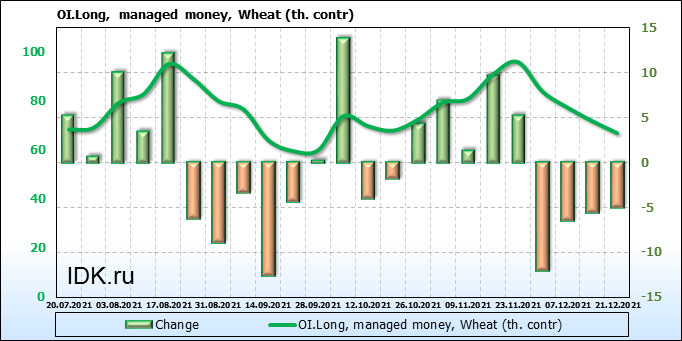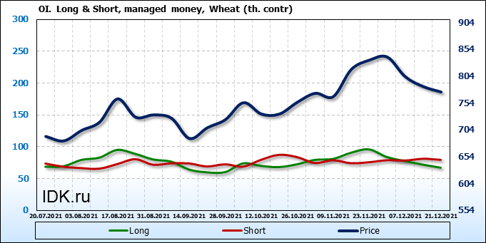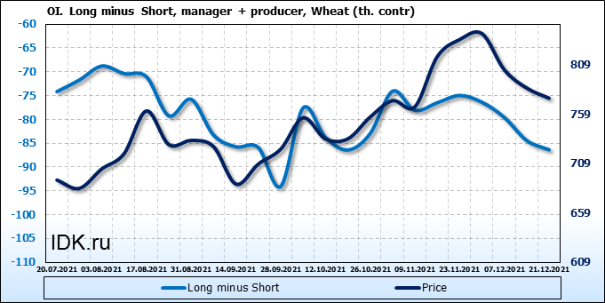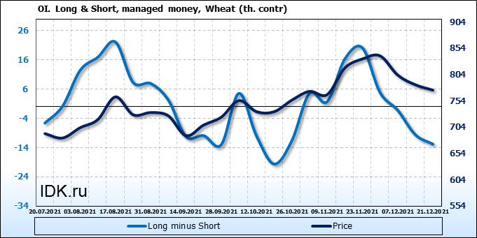 За прошедшую неделю, 15.12.21 — 21.12.21, разница между длинными и короткими позициями управляющих увеличилась на 3.2 тыс. контрактов. В тоже время, цена упала на 10.2 цента.