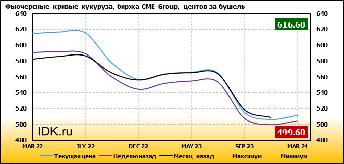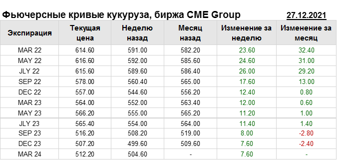 На 27.12.2021 стоимость кукурузы на бирже CME Group по контракту MAR 22 составила 614.6 цента за бушель. За прошедшую неделю стоимость кукурузы на площадке CME Group выросла на 23.6 цента/бушель. Как мы видим на графике, фьючерсная кривая имеет периоды, когда более дальний фьючерс дешевле ближнего. Состояние бэквардации наблюдаем на следующих контрактах: JLY 22; SEP 22; DEC 22; JLY 23; SEP 23; DEC 23. Таким образом, трейдеры предполагают, что возможно превалирование предложения над спросом в указанные периоды.
