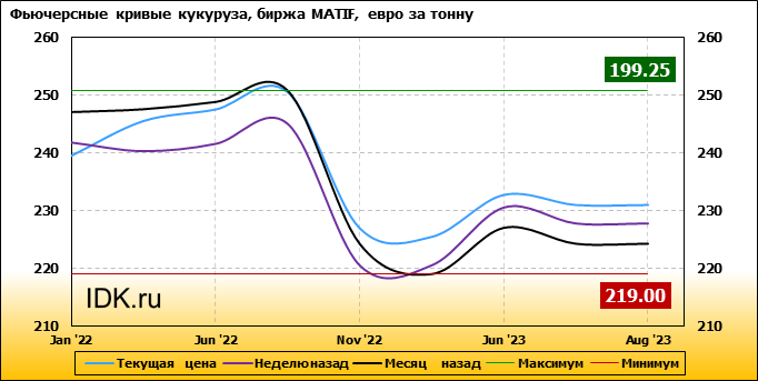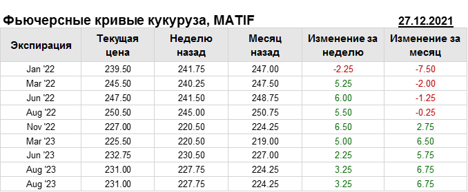 На 27.12.2021 стоимость кукурузы на бирже MATIF по контракту Jan ’22 составила 239.5 евро за тонну. За прошедшую неделю стоимость кукурузы на европейской площадке упала на 2.25 евро/тонна. Как мы видим на графике, фьючерсная кривая имеет периоды, когда более дальний фьючерс дешевле ближнего. Состояние бэквардации наблюдаем на следующих контрактах: Nov ’22; Mar ’23; Aug ’23. Таким образом, трейдеры предполагают, что возможно превалирование предложения над спросом в указанные периоды.