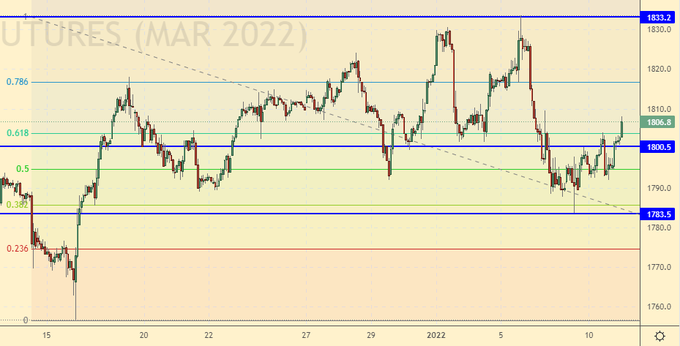 Фондовый рынок в США начал коррекцию, которая может перерасти в нечто большее, поэтому на золото находятся покупатели. Неспособность рынка уйти ниже 1780 может привести в ближайшие дни к формированию условий для похода к 1850.