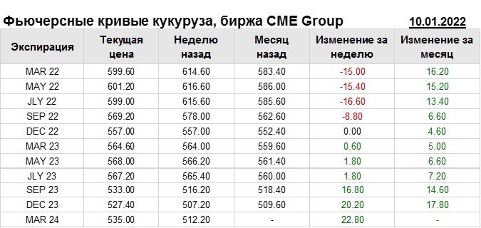 На 10.01.2022 стоимость кукурузы на бирже CME Group по контракту MAR 22 составила 599.6 цента за бушель. За прошедшую неделю стоимость кукурузы на площадке CME Group упала на 15 центов/бушель. Как мы видим на графике, фьючерсная кривая имеет периоды, когда более дальний фьючерс дешевле ближнего. Состояние бэквардации наблюдаем на следующих контрактах: JLY 22; SEP 22; DEC 22; JLY 23; SEP 23; DEC 23. Таким образом, трейдеры предполагают, что возможно превалирование предложения над спросом в указанные периоды.
