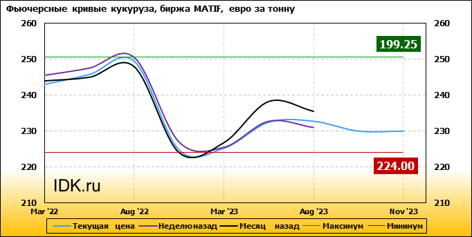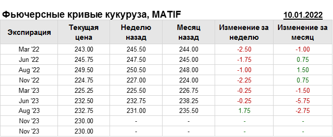 На 10.01.2022 стоимость кукурузы на бирже MATIF по контракту Mar ’22 составила 243 евро за тонну. За прошедшую неделю стоимость кукурузы на европейской площадке упала на 2.5 евро/тонна. Как мы видим на графике, фьючерсная кривая имеет периоды, когда более дальний фьючерс дешевле ближнего. Состояние бэквардации наблюдаем на следующих контрактах: Nov ’22; Nov ’23. Таким образом, трейдеры предполагают, что возможно превалирование предложения над спросом в указанные периоды.