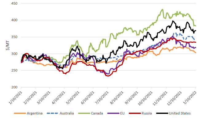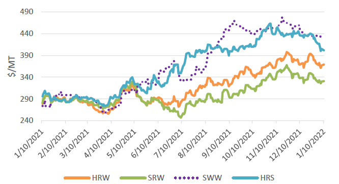 Экспортные цены в США для всех четырех классов упали после публикации декабрьского отчета WASDE в ответ на более высокие урожаи в Южном полушарии в Австралии и Аргентине, а также ослабленный внешний спрос, поскольку цены в США по-прежнему неконкурентоспособны, несмотря на недавнее снижение. Hard Red Spring (HRS) резко упала на 39 долларов за тонну по сравнению с прошлым месяцем, отражая ограниченный спрос при исключительно высокой цене в 402 доллара за тонну, что почти на 37 процентов выше, чем в прошлом году. Аналогичным образом Soft White Winter (SWW) снизилась на 23 доллара за тонну до 434 долларов за тонну из-за слабого зарубежного спроса. Hard Red Winter (HRW) подешевела на 10 долларов за тонну до 369 долларов, в то время как Soft Red Winter (SRW) остановилась на уровне 331 доллар, снизившись на 17 долларов за тонну.