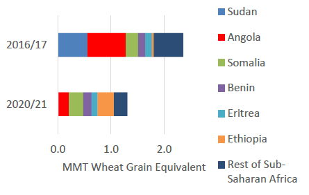 За последние 5 лет в странах Африки к югу от Сахары произошли изменения на рынке импорта пшеничной муки. В 2016/17 году Ангола и Судан были двумя крупнейшими импортерами пшеничной муки, в основном от трех крупнейших поставщиков в регион: Турции, Египта и ЕС. На эти три страны приходится 80 процентов мирового экспорта в страны Африки к югу от Сахары. В настоящее время Ангола и Судан играют гораздо меньшую роль, в то время как другие страны, такие как Эфиопия, Сомали и Бенин, стали новыми ключевыми импортерами. В целом импорт пшеничной муки в регион сократился примерно на 40 процентов за последние 5 лет, в то время как импорт зерна пшеницы увеличился, поскольку африканские страны инвестируют в собственное мукомольное производство.