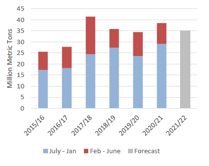 Прогноз экспорта пшеницы из России на 2021/22 год был сокращен до 35,0 млн тонн, поскольку страна продолжает реализовывать политику, направленную на обеспечение достаточных внутренних запасов и стабилизацию внутренних цен на продовольствие путем ограничения экспорта. Правительство объявило введение квоты на экспорт зерна в размере 11,0 млн тонн с 15 февраля по 30 июня 2022 года, из которых на пшеницу придется 8,0 млн тонн. Россия экспортировала 21,6 млн тонн в период с июля по декабрь 2021 года. В прошлом году экспортеры поспешили экспортировать свою пшеницу до вступления в силу квоты с 15 февраля, и в этом году, скорее всего, этот сценарий повторится.