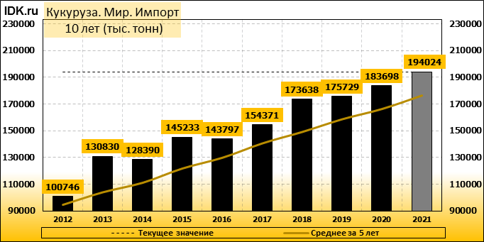 Мировое производство кукурузы в 2021/22 году снижено из-за сокращения урожаев в Аргентине, Бразилии, Кении и Мексике, которое превосходит повышение производства в Украине и США. Мировая торговля прогнозируется выше, чем в прошлом месяце, поскольку в Украине ожидается увеличение экспортного предложения, а в Аргентине и Бразилии — более активный, чем ожидалось, экспорт в начале торгового года. Более высокий экспорт этих стран более чем компенсирует сокращение экспорта Парагвая и Соединенных Штатов. Мировой импорт также повышен за счет увеличения импорта Бразилии, Канады и Мексики.