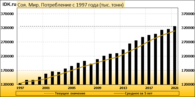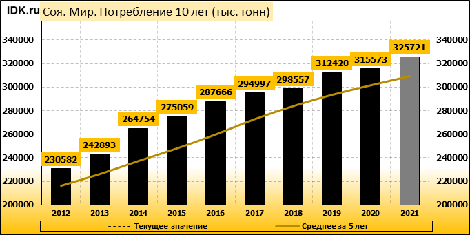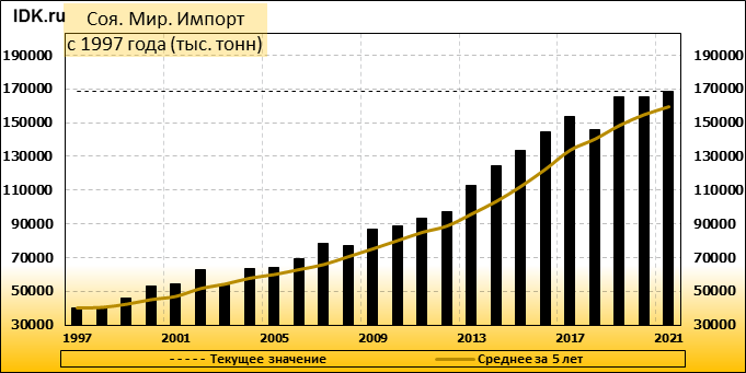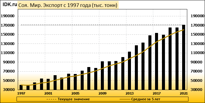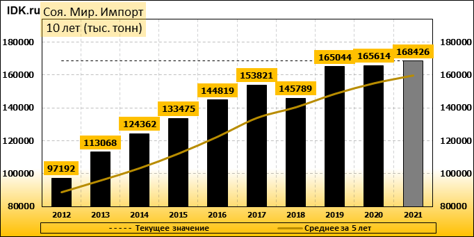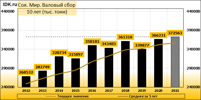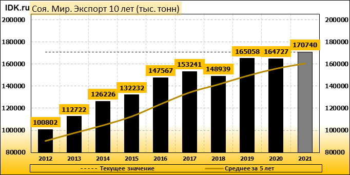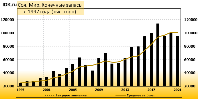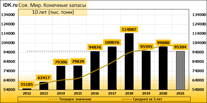 Прогноз по мировому рынку сои на 2021/22 год включает снижение производства, переработки, экспорта и остатков. Производство сои за пределами США снижено на 9,5 млн тонн за счет сокращения урожаев в Бразилии, Аргентине и Парагвае. Урожай сои в Бразилии снижен на 5 млн тонн до 139 млн из-за засушливых погодных условий в декабре и начале января на юге Бразилии. Урожай в Аргентине сокращен на 3 миллиона тонн до 46,5 миллиона как из-за уменьшения как площади, так и урожайности. Мировые остатки сои сокращены на 6,8 млн тонн до 95,2 млн из-за снижения остатков в Бразилии и Аргентине.