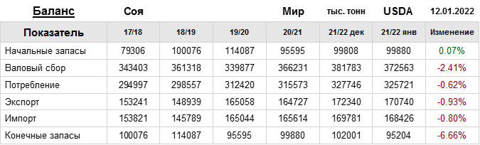 За прошедший месяц министерство сельского хозяйства США (USDA) на 12.01.2022 пересмотрело Баланс сои для Мира в сезоне 21/22 следующим образом: