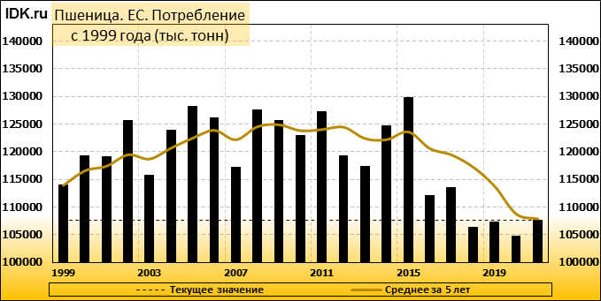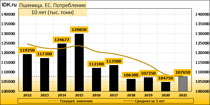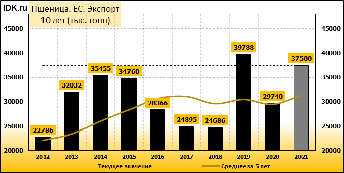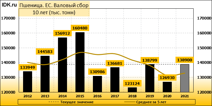 Производство пшеницы в Европейском союзе оценивается в 138,90 млн метрических тонн, что на 0,20 млн тонн больше, чем ожидалось в прошлом месяце, и на 11,97 млн тонн больше, чем было произведено в предыдущем году. Уборочная площадь оценивается в 24,14 млн га, по сравнению с 24,10 млн га в прошлом месяце, что более чем на 1,00 млн га больше, чем в предыдущем году. Оценка урожайности при этом не изменилась и составляет 5,76 т/га. Прогноз экспорта пшеницы из ЕС в 2021/22 году повышен на 500 тыс. тонн до 37,5 млн тонн за счет увеличения прогноза производства и конкурентоспособного ценообразования.
