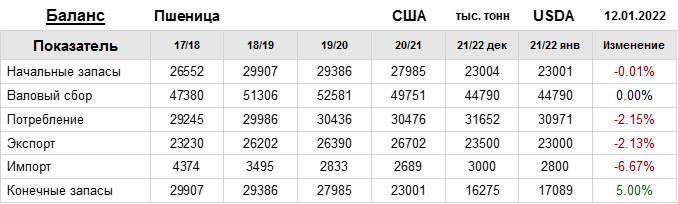 За прошедший месяц министерство сельского хозяйства США (USDA) на 12.01.2022 пересмотрело Баланс пшеницы для США в сезоне 21/22 следующим образом:
