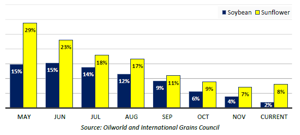 За вторую половину 2021 года дисконт на пальмовое масло почти исчез и в настоящее время составляет всего 2% к соевому маслу и 8% к подсолнечному маслу. Для сравнения в среднем ценовая разница составляла 12 процентов для соевого и 21 процент для подсолнечного масла за предыдущие 10 лет. Хотя нынешний дисконт не являются беспрецедентным, тем не менее это редкое явление, которое отражает как высокий спрос на пальмовое масло, так и его ограниченную доступность.