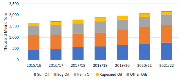 В 2021/22 году продовольственное потребление подсолнечного масла в Иране прогнозируется на рекордном уровне в 775 000 тонн с рекордной долей в общем потреблении растительного масла на уровне 36 процентов. В случае реализации прогноза доля подсолнечного масла в общем потреблении масла в Иране увеличится в десяти из последних 11 лет. Если эта тенденция сохранится, подсолнечное масло превзойдет соевое масло в качестве наиболее потребляемого пищевого масла в Иране в течение 2 лет.