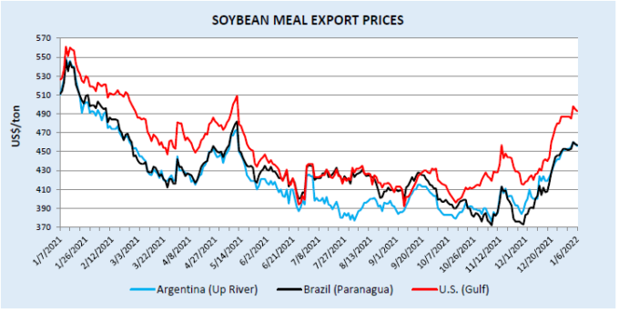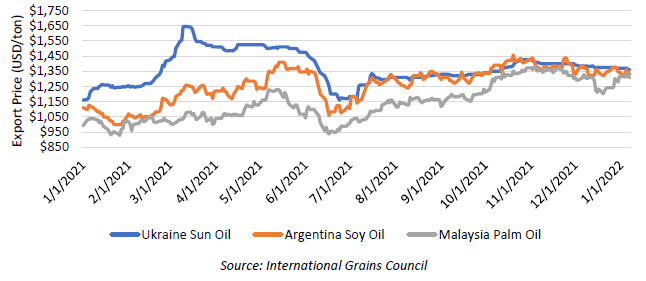 Цены на соевое масло продолжали снижаться с ноября, поскольку высокие мировые цены на масло ограничивали спрос. Цены достигли минимума в середине декабря и с тех пор росли до начала января 2022 года. В последние недели цены на пальмовое масло росли из-за ограниченного предложения в Малайзии и Индонезии, где возникли проблемы с погодой. Проблемы с погодой в Южной Америке также способствовали росту цен на соевые бобы и, как следствие, на соевое масло. Спрос остается высоким, поддерживая цены.