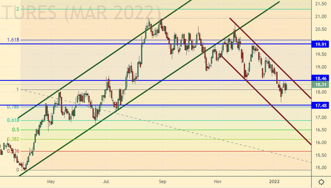 Сценарий роста: рассматриваем мартовский фьючерс, дата экспирации 28 февраля. Вы должны были купить при подходе к 17.50. Теперь, держим лонги, рассчитываем на возврат к уровню 20.00, возможно пройдем и выше.