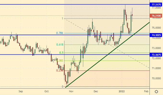 Покупка: сейчас. Стоп: 73.10. Цель: 82.00. Кто в позиции от 75.20 и 74.30, держите стоп на 73.10. В случае резкого прокола к 72.00, ЦБ может попытаться наказать спекулянтов, агрессивно покупать, но перед этим внимательно проанализировать текущий новостной фон.