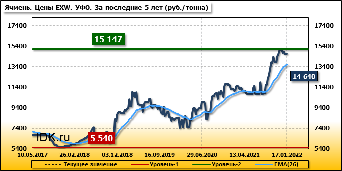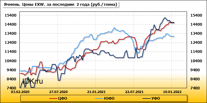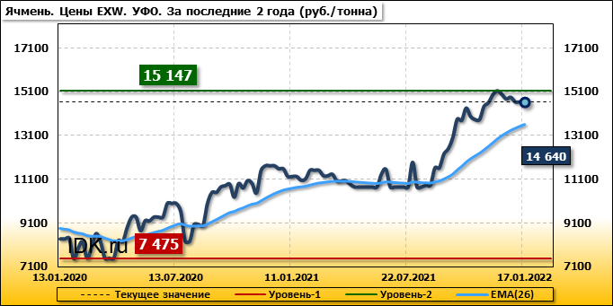 Внутренние цены на ячмень в Уральском федеральном округе упали на 214 руб./т. и на данный момент составляют 14640 рублей за тонну.