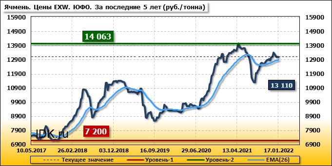 В Южном федеральном округе внутренние цены на ячмень упали на 84 руб./т. и на данный момент составляют 13110 рублей за тонну.