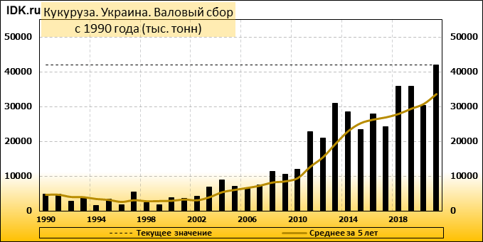 Производство кукурузы в Украине в 2021/22 маркетинговом году оценивается на рекордном уровне в 42,0 млн метрических тонн, что на 5% больше, чем в прошлом месяце, и на 39% больше, чем в прошлом году. Урожайность оценивается в рекордные 7,92 тонны с гектара, что на 7% больше, чем в прошлом месяце, и на 41% больше, чем в прошлом году. Уборочная площадь оценивается в 5,3 миллиона гектаров, что на 2 процента меньше, чем в прошлом месяце и в прошлом году. Производство повышено месяц к месяцу на основе данных об урожае от Государственной службы статистики Украины (ГССУ) и Министерства сельского хозяйства Украины (МинАГ).