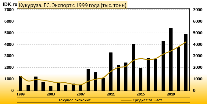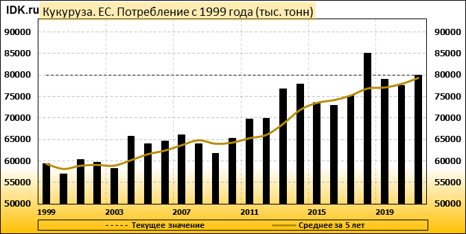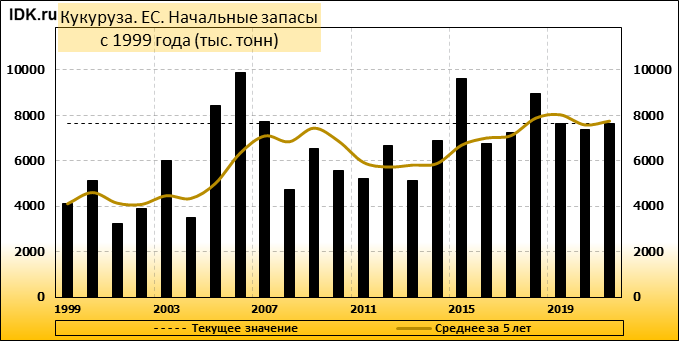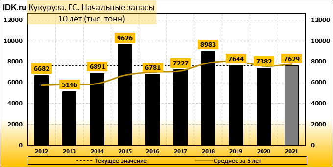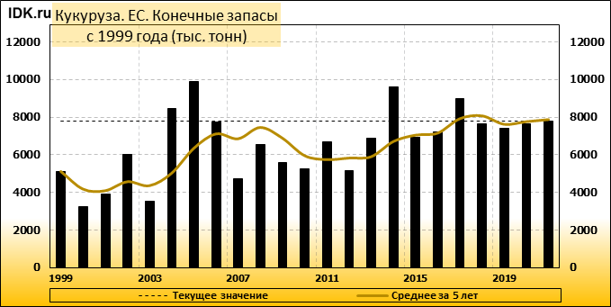 Производство кукурузы в Европейском союзе (ЕС) в 2021/22 маркетинговом году оценивается в 69,96 млн метрических тонн, что на 0,39 млн тонн, или 0,55 процента меньше, по сравнению с прошлым месяцем, но на 2,87 млн тонн или 4,27 процентов больше по сравнению с прошлым годом. Уборочная площадь оценивается в 9,31 миллиона гектаров, что на 0,5 процента больше, чем ожидалось в прошлом месяце, и практически без изменений по сравнению с прошлогодним показателем. Урожайность оценивается в 7,52 тонны с гектара, без изменений по сравнению с оценкой прошлого месяца и на 4 процента выше, чем в прошлом году.