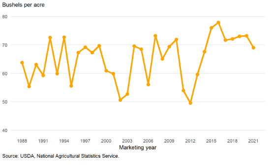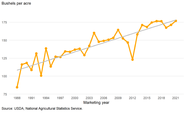 Рисунок 1. Урожайность кукурузы в США с 1988 по 2021 гг.
