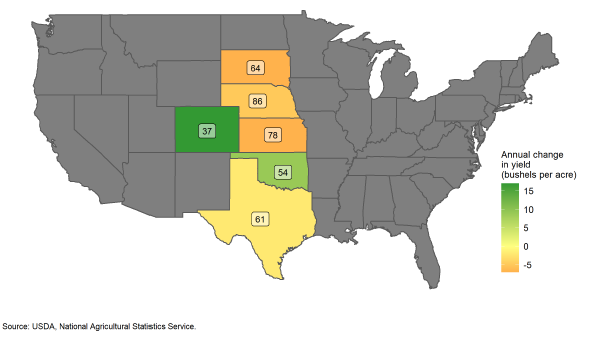 В Канзасе и Южной Дакоте наблюдается самое большое годовое снижение урожайности на 7 бушелей на акр для каждого. В Колорадо и Оклахоме оценки урожайности увеличились на 17 и 9 бушелей с акра соответственно.