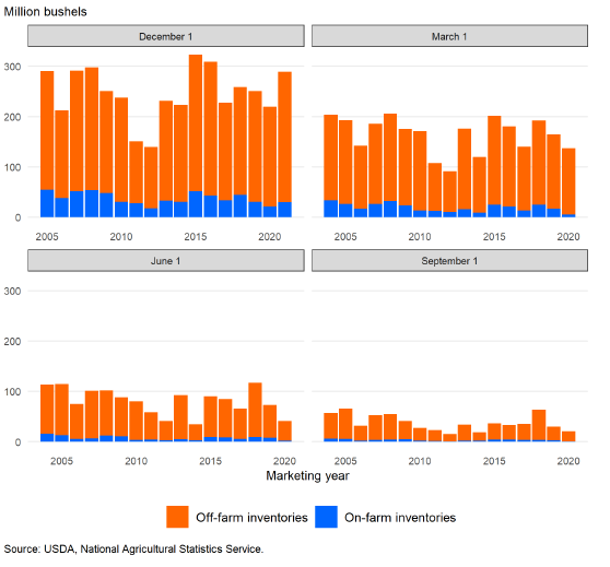 Прогноз кормового и остаточного потребления кукурузы на 2021/22 год в настоящее время составляет 5 650 миллионов бушелей, без изменений по сравнению с декабрьским прогнозом. В последнем выпуске отчета о запасах сообщается, что на 1 декабря 2021 года запасы составляют 11 647 миллионов бушелей. Это на 353 миллиона бушелей больше, чем запасы на 1 декабря 2020 года. Оценка запасов также подразумевает кормовое и остаточное потребление на уровне 2 584 млн бушелей в течение первых 3 месяцев 2021/22 года. Этот квартальный прогноз кормового и остаточного потребления на 4% ниже, чем за тот же период 2020/21 года.