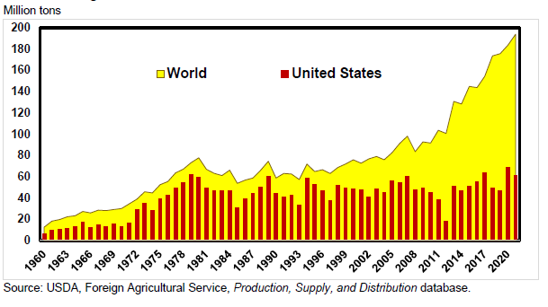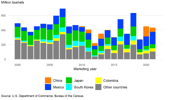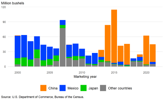 Доля США на мировом рынке стала сильно зависеть от размера урожая и ценовой конкурентоспособности этих трех стран, поскольку более крупные урожаи и обесценивание их валют по отношению к доллару США повышают ценовую конкурентоспособность этих стран, что, как правило, ограничивает экспорт США. Прогнозируется, что в 2021/22 году совокупный объем производства кукурузы в Бразилии, Аргентине и Украине будет на 41,2 млн тонн выше, чем в прошлом году, в то время как производство кукурузы в Соединенных Штатах вырастет по сравнению с прошлым годом на 25,5 млн тонн. Валюты всех трех стран-конкурентов США обесценились с ноября 2021 года.