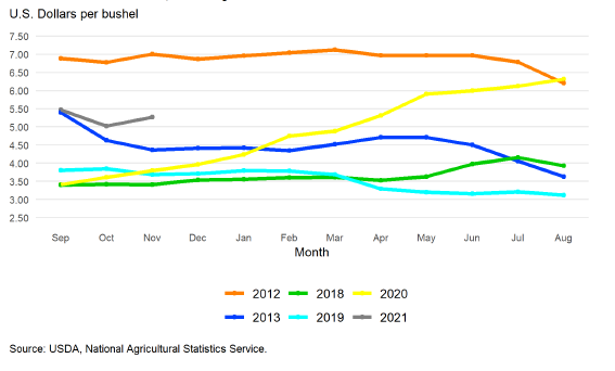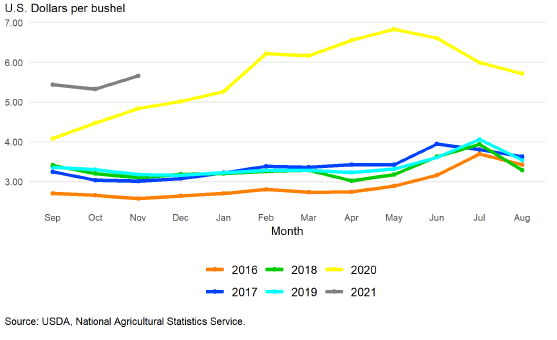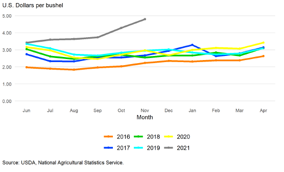Среднесезонная цена на ферме прогнозируется на уровне 5,45 доллара за бушель на 2021/22 год, без изменений по сравнению с декабрьским прогнозом. Согласно последнему отчету NASS о ценах на сельскохозяйственную продукцию, средняя цена по стране, полученная производителями в ноябре 2021 года, составила 5,27 доллара за бушель. Наличные и фьючерсные цены продолжали неуклонно расти с тех пор, как в сентябре начался сбор урожая этого года. Исторически большая часть кукурузы продается производителями в период с сентября по январь. Это означает, что месячные цены весной и летом будут иметь меньшее влияние на средние показатели маркетингового года, чем цены, зарегистрированные до конца января.