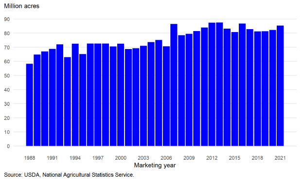 Рисунок 2. Уборочная площадь кукурузы в США с 1988 по 2021 гг.
