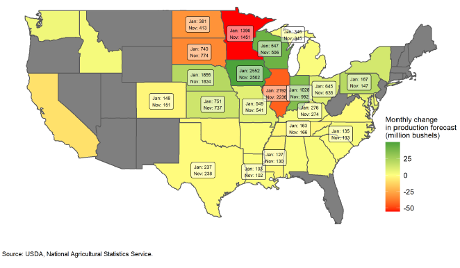 На уровне штатов, по сравнению с предыдущими прогнозами NASS, опубликованными в ноябре, сокращение производства ожидается в Миннесоте (на 55 млн бушелей), Иллинойсе (на 44 млн бушелей), Южной Дакоте (на 34 млн бушелей) и Северной Дакоте (на 32 млн бушелей).