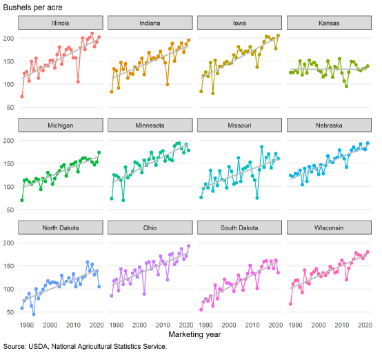 В то время как урожайность кукурузы в стране была рекордной, показатели урожайности кукурузы на уровне штатов варьировались. Это, по-видимому, тесно связано с общими условиями выращивания, имевшими место в 2021 году, с в основном засушливыми условиями в западных штатах и обильными (а местами слишком обильными) осадками во многих южных и восточных штатах. Рекордные показатели урожайности кукурузы зарегистрированы в Мичигане, Огайо, Индиане, Айове, Висконсине и Небраске (благодаря значительному количеству орошаемых площадей). Сообщается, что урожайность в Северной Дакоте, Южной Дакоте и Миннесоте значительно ниже, чем трендовая урожайность в этих штатах. Несмотря на более низкие показатели урожайности в Северной Дакоте и Южной Дакоте, расширение уборочных площадей привело к увеличению производства кукурузы в годовом исчислении. Однако производство кукурузы снизилось по сравнению с 2020/21 годом в Миннесоте, Миссури и Канзасе.