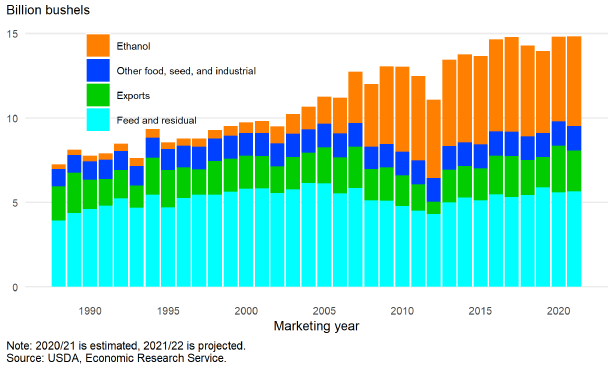 Потребление кукурузы в США в продовольствии, семенах и промышленных целях в 2021/22 году прогнозируется на уровне 6 760 миллионов бушелей, что на 80 миллионов бушелей больше, чем ожидалось в декабрьском прогнозе. Это увеличение в основном связано с повышением использования кукурузы для производства топливного этанола на 75 миллионов бушелей до 5 325 миллионов бушелей. В дополнение к повышению производства топливного этанола, использование кукурузы для производства глюкозы и декстрозы, увеличено на 5 миллионов бушелей до 365 миллионов бушелей в 2021/22 году, исходя из темпов использования в течение первых 3 месяцев маркетингового года.