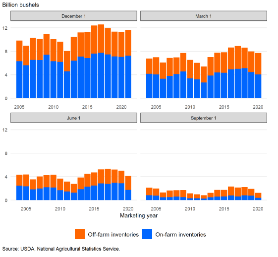 Рисунок 6. Запасы кукурузы в США поквартально, на фермах и вне ферм.