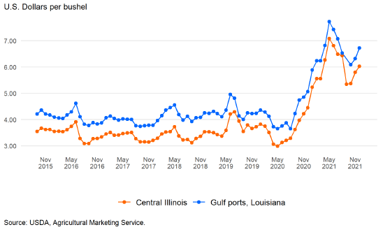 Спотовые цены на кукурузу в декабре 2021 года продолжали расти на всей территории США и остаются значительно выше ценовых уровней, зарегистрированных в 2020/21 году. Средняя наличная цена в Центральном Иллинойсе составляла 6,03 доллара в этом месяце по сравнению с 5,80 доллара в ноябре 2021 года и 4,45 доллара в декабре 2020 года. Аналогичным образом, на рынках экспортных терминалов Мексиканского залива спотовая цена составляла 6,72 доллара в декабре 2021 года по сравнению с 6,32 доллара в ноябре и 5,06 доллара в декабре 2020 года.