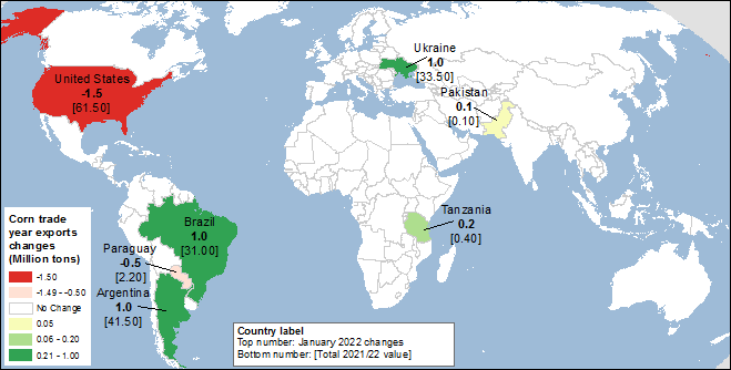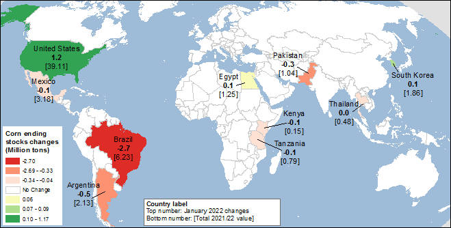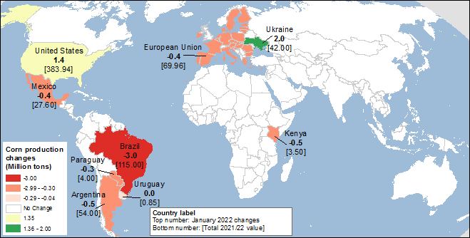 Карта 1. Изменения производства кукурузы (млн. тонн) для 2021/22 года, январь 2022.