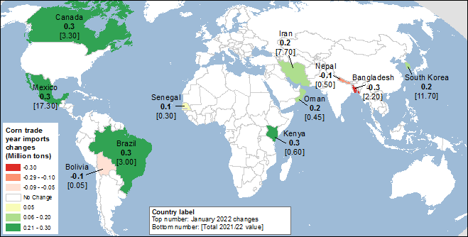 В дополнение к повышению прогнозируемого импорта для Бразилии, о котором говорилось выше, импорт кукурузы также повышен для Канады на основе данных о высоких обязательствах. Импорт кукурузы в Мексику также повышен, что отражает темпы продаж желтой кукурузы (в то время как сама страна производит в основном белую кукурузу). Импорт кукурузы скорректирован в сторону уменьшения для Бангладеш как на 2020/21, так и на 2021/22 годы. Более высокий импорт кукурузы также прогнозируется для Ирана, основного экспортного рынка Бразилии, где в этом месяце ожидается увеличение экспорта. В связи с сокращением прогноза производства кукурузы в Кении прогнозируется увеличение импорта. Импортная пошлина страны была снижена для кукурузы, не содержащей ГМО, которую, как ожидается, она будет поставлять в основном из Танзании. Изменения экспорта и импорта кукурузы для международного торгового года наглядно представлены на картах 2 и 3 ниже.