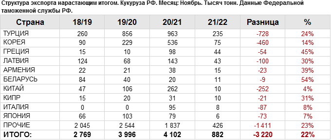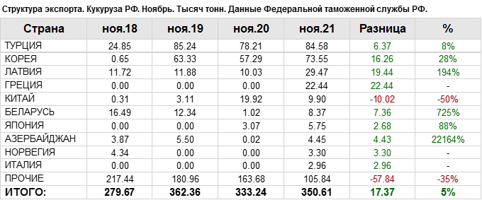 Объем поставок кукурузы на экспорт за период с июля 2021 года по ноябрь 2021 года в Турцию составил 235.19 тыс. тонн, что на 140.12 тыс. тонн больше объема поставок в данную страну в прошлом сезоне на тот же отчетный месяц.
