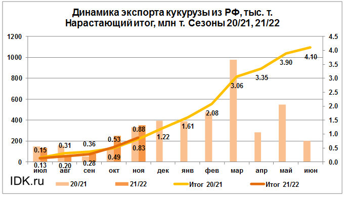 В текущем сезоне объем поставок кукурузы на экспорт достиг 881.99 тыс. тонн. Данный объем на текущий момент составляет 22% от объема прошлого сезона.