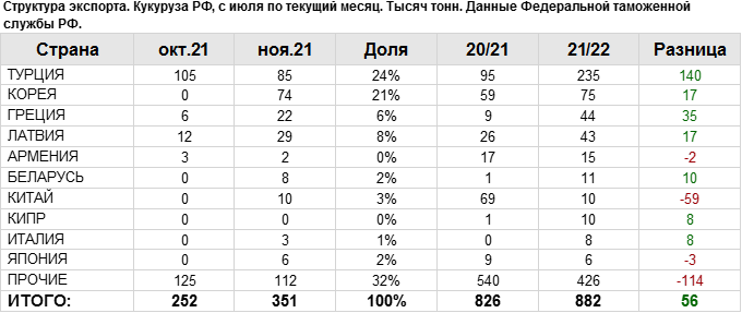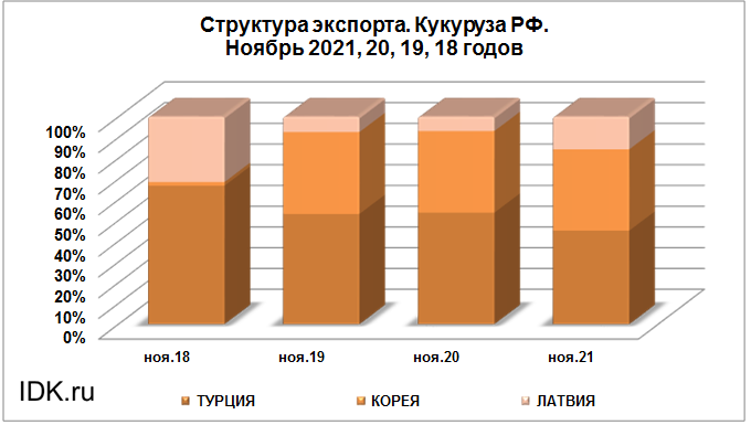 Структура экспорта кукурузы из России за ноябрь 2021 года